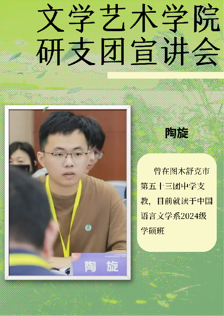 第二十五届研究生支教团成员陶旋以个人成长蜕变为主线,讲述了从支教“新手”到“能独当一面”的成长过程。初到支教地时,他面临教学与环境的双重挑战,而当地老教师的坚守精神与悉心指导让他逐渐掌握了教学技巧,学会根据学生特点因材施教成为能够独当一面的老师。“支教是一次自我成长的旅程,去南疆支教,你将收获的不仅仅是教学经验,更是人生的宝贵财富。”他的感悟与鼓励进一步坚定了在场学子投身于西部教育的信念。